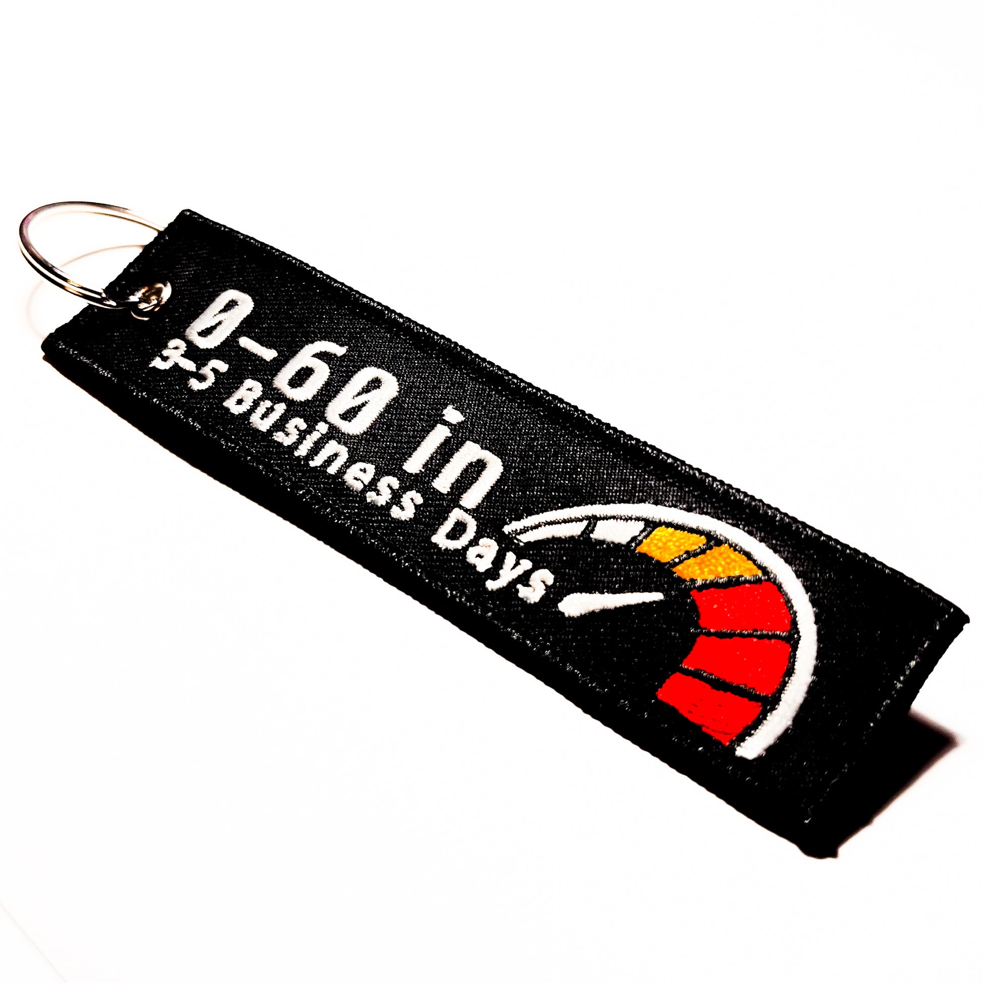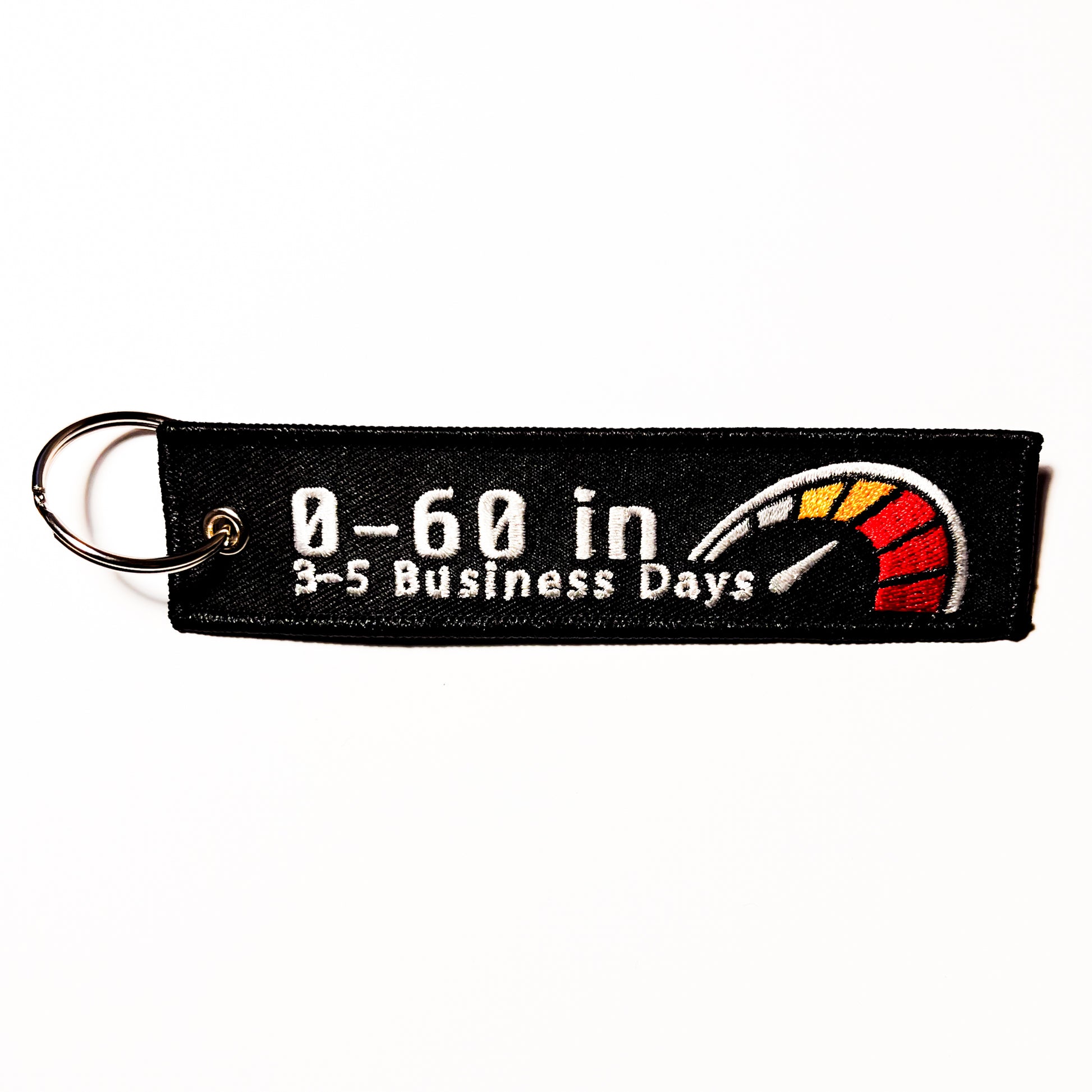 Inject some humor into your everyday with our 1.3-Inch by 5-Inch embroidered "0-60 Time Trials" Flight Tag. Featuring the witty message “0-60 in 3-5 business days”, this tag is the perfect accessory for those who appreciate the finer things in life...like getting taken to Gapplebees by an 18-wheeler on the highway.
