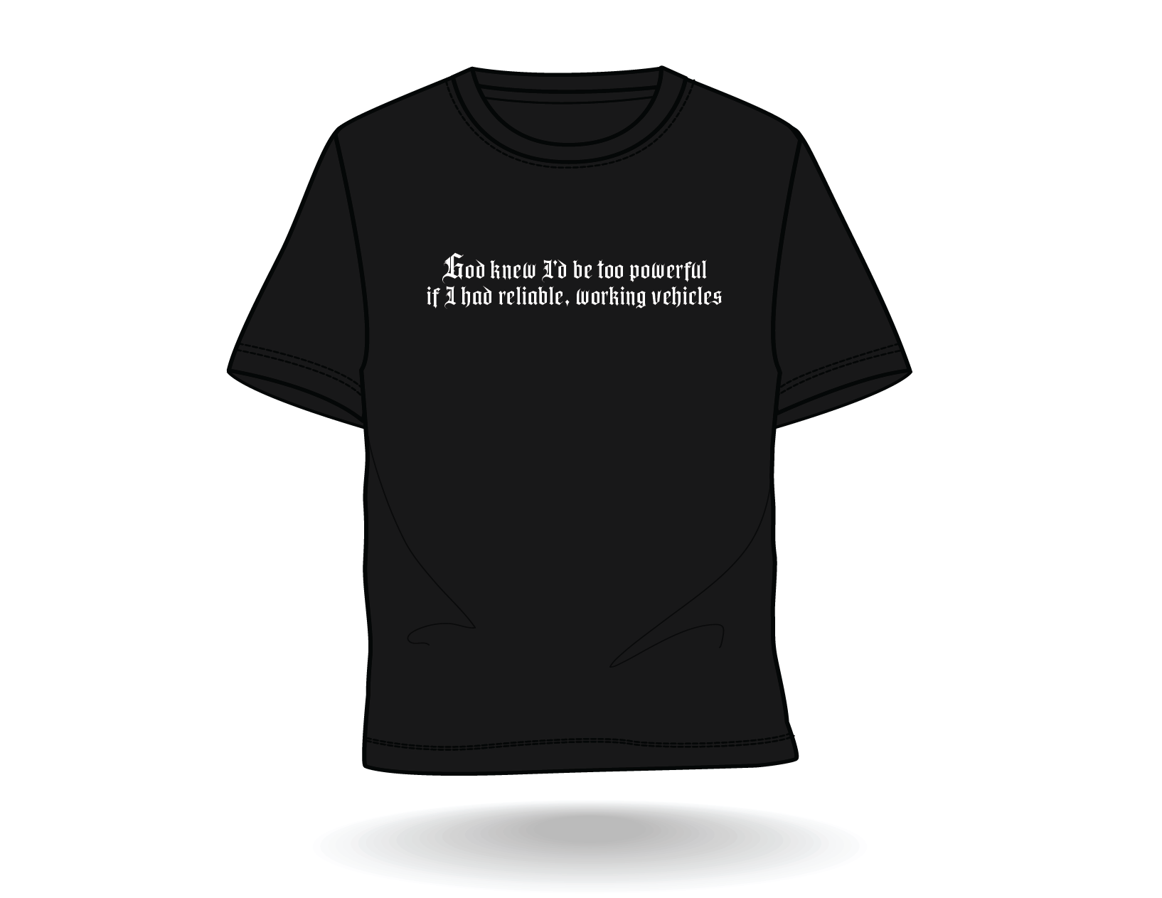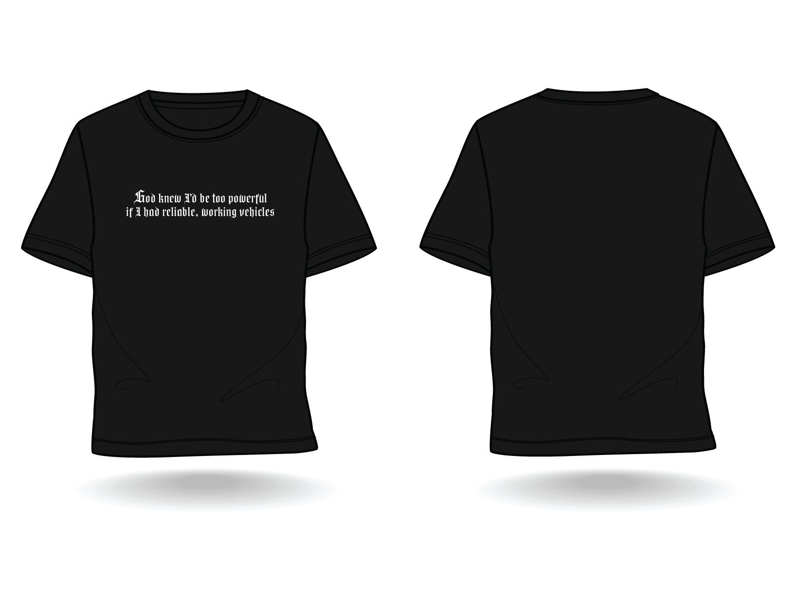 With the gothic phrase, “God knew I’d be too powerful if I had reliable, working vehicles” on the front, this shirt reflects the resiliency of off-road enthusiasts alike. It's a statement that those who live for the trails understand – when things go wrong, it’s just another opportunity to fix, modify, and keep going.