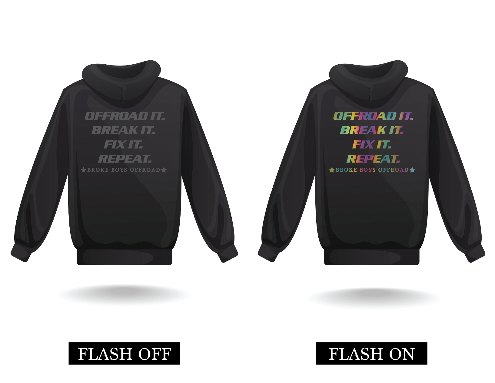 By popular demand, our best-selling tee is now a hoodie! Meet the Broke Boys Reflective Oil Slick Trail Hoodie, a must-have for off-roaders who want to turn heads day or night.