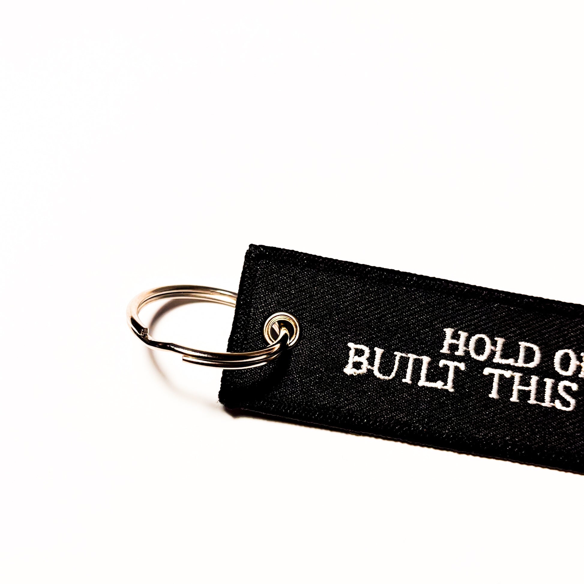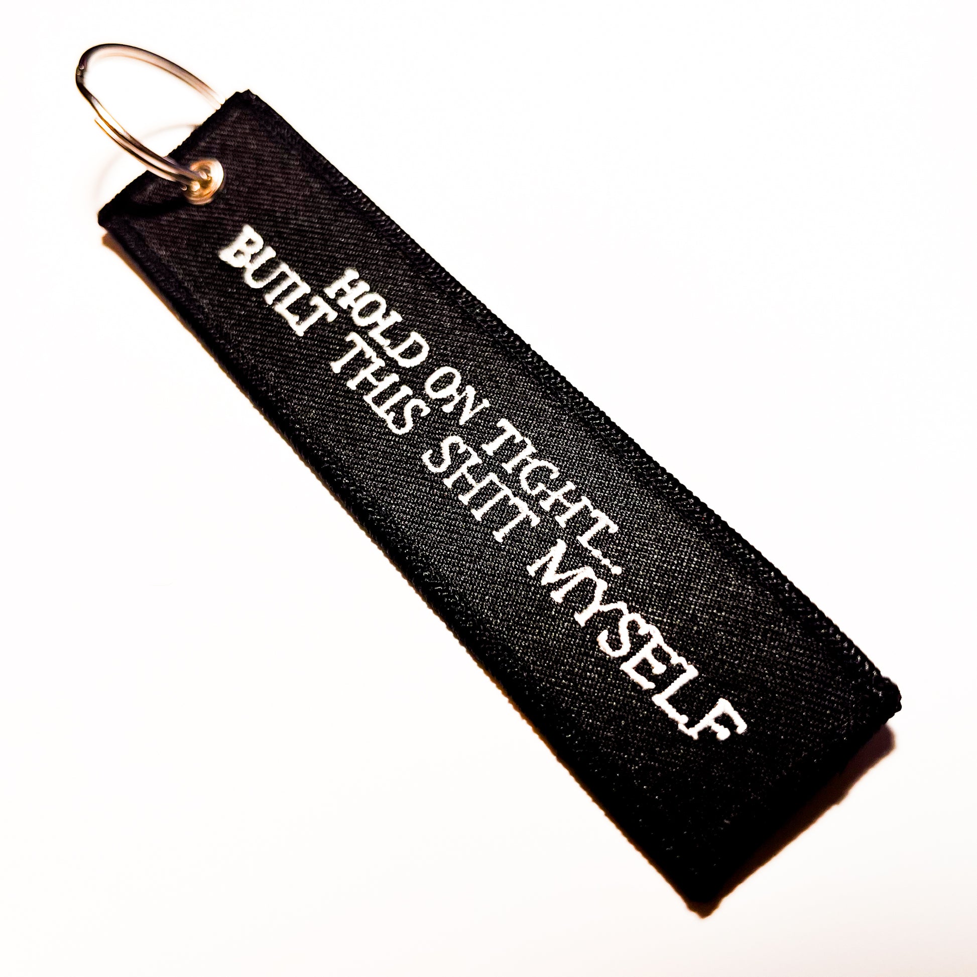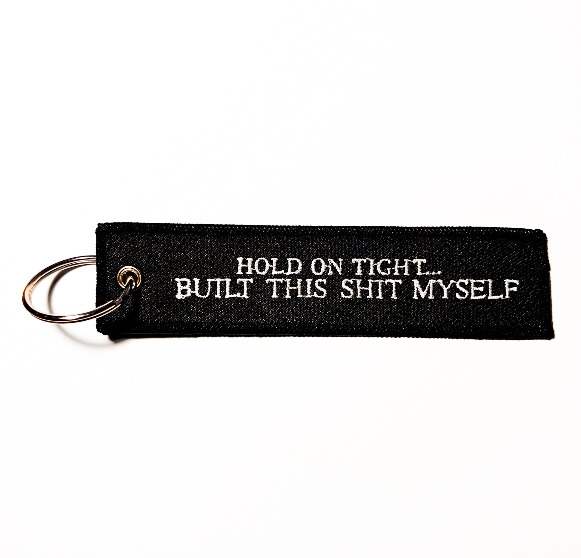 On one side, it boldly declares, 'keys to my death trap,' reminding us that adventure often comes with a sprinkle of risk. Flip it over, and you'll find the humorous motto, 'hold on tight, I built this shit myself,' because who needs professionals when you're a questionably legal YouTube-certified part-time mechanic?