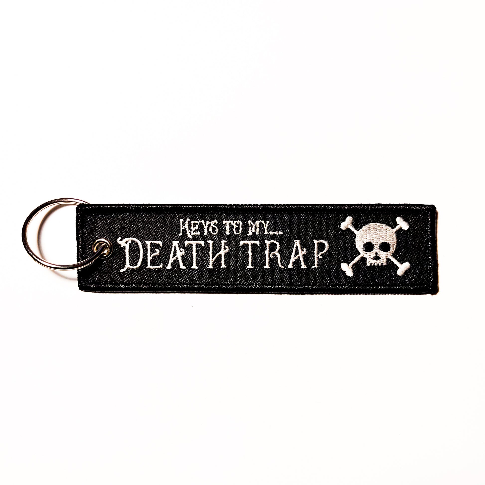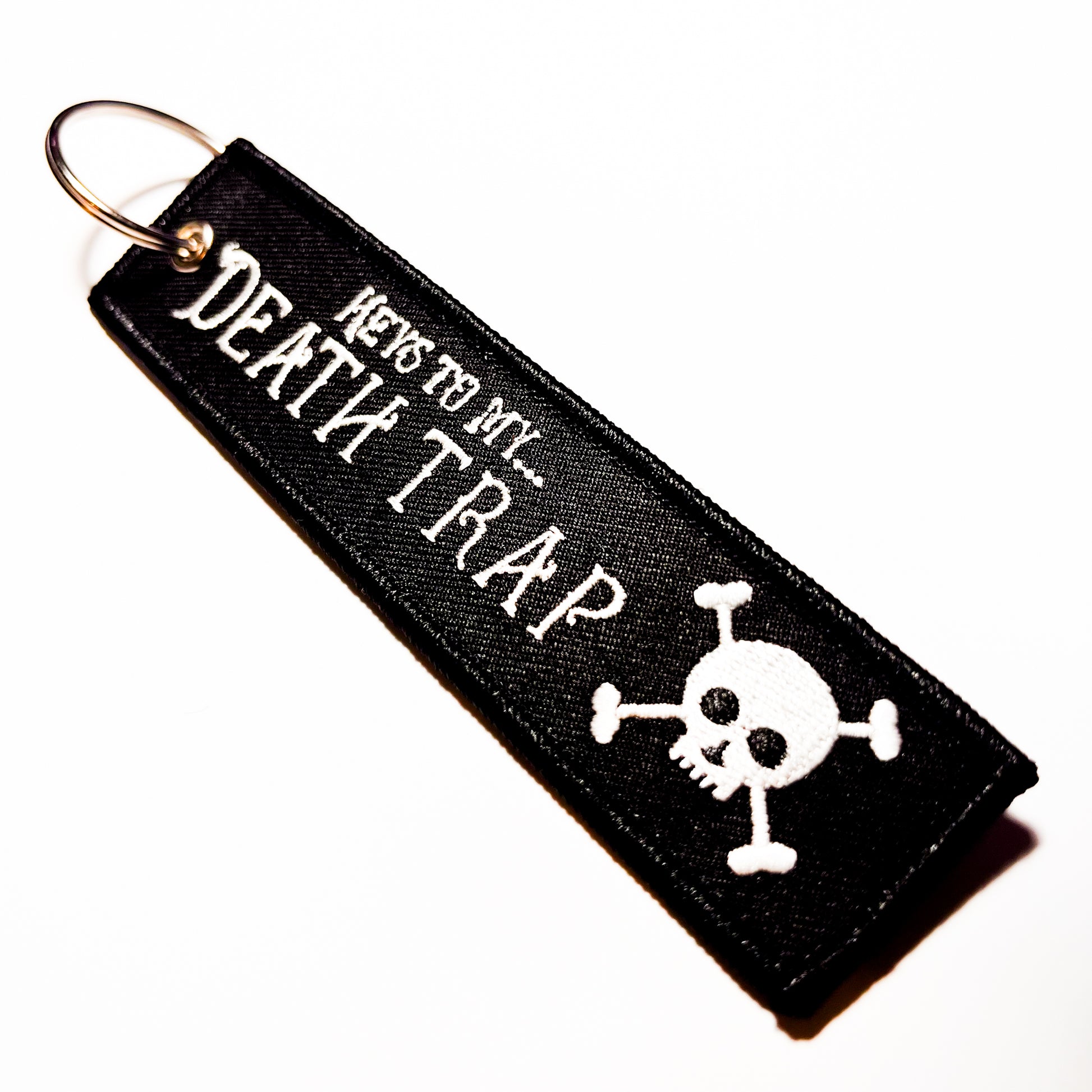Introducing our 1.3-Inch by 5-Inch embroidered "Death Trap" Flight Tag, the ultimate accessory for those who embrace monkey wrenching on your project car with a sense of humor.