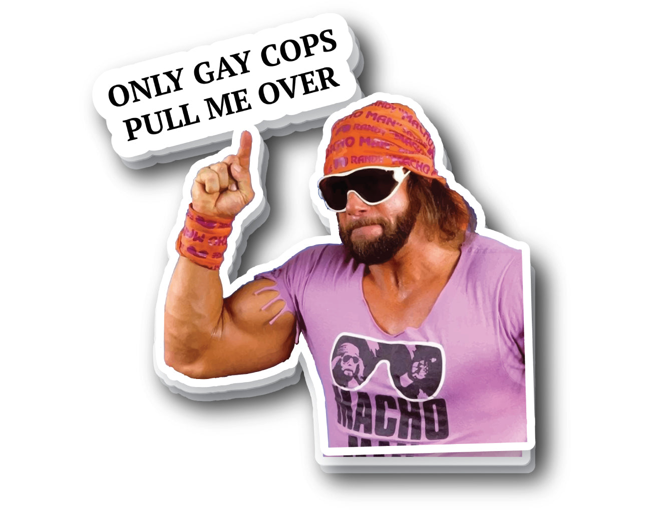 As a proud owner of a daily driven offroad vehicle, you know that getting stopped by the authorities for minor infractions such as tire poke, window tint or exhaust noise is just another part of the adventure. Our “Only Gay Cops Pull Me Over” sticker featuring an iconic meme of “Macho Man” Randy Savage pokes fun at the idea of cops having nothing better to do than pick on car guys for their choice of modifications.