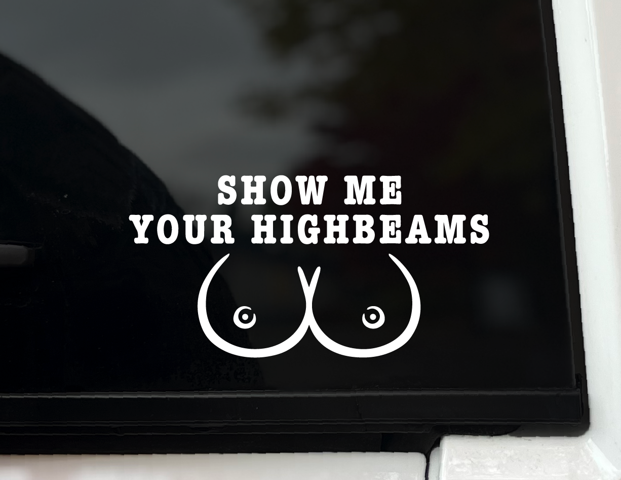 Designed with the average male consumer in mind, while making a humorous spin off the commonly known headlight mode – our “Show Me Your Highbeams” Vinyl Decal is the perfect addition to the back of your rig.