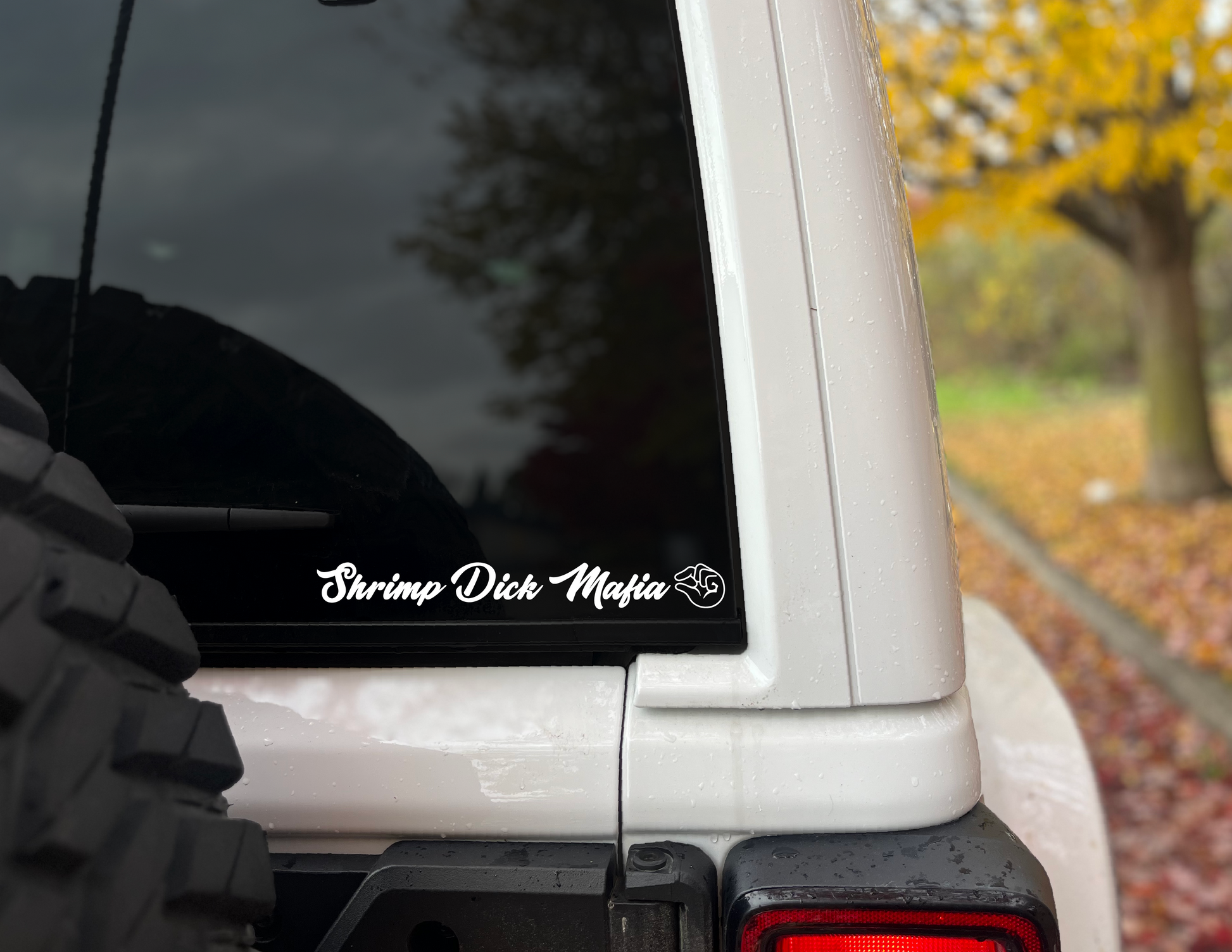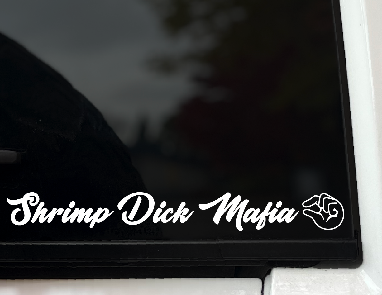 Introducing our "Shrimp Dick Mafia" Vinyl Decal - the ultimate wink-and-nudge to those out there who think that having a nicer-than-average ride means you must be compensating for something.