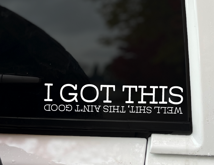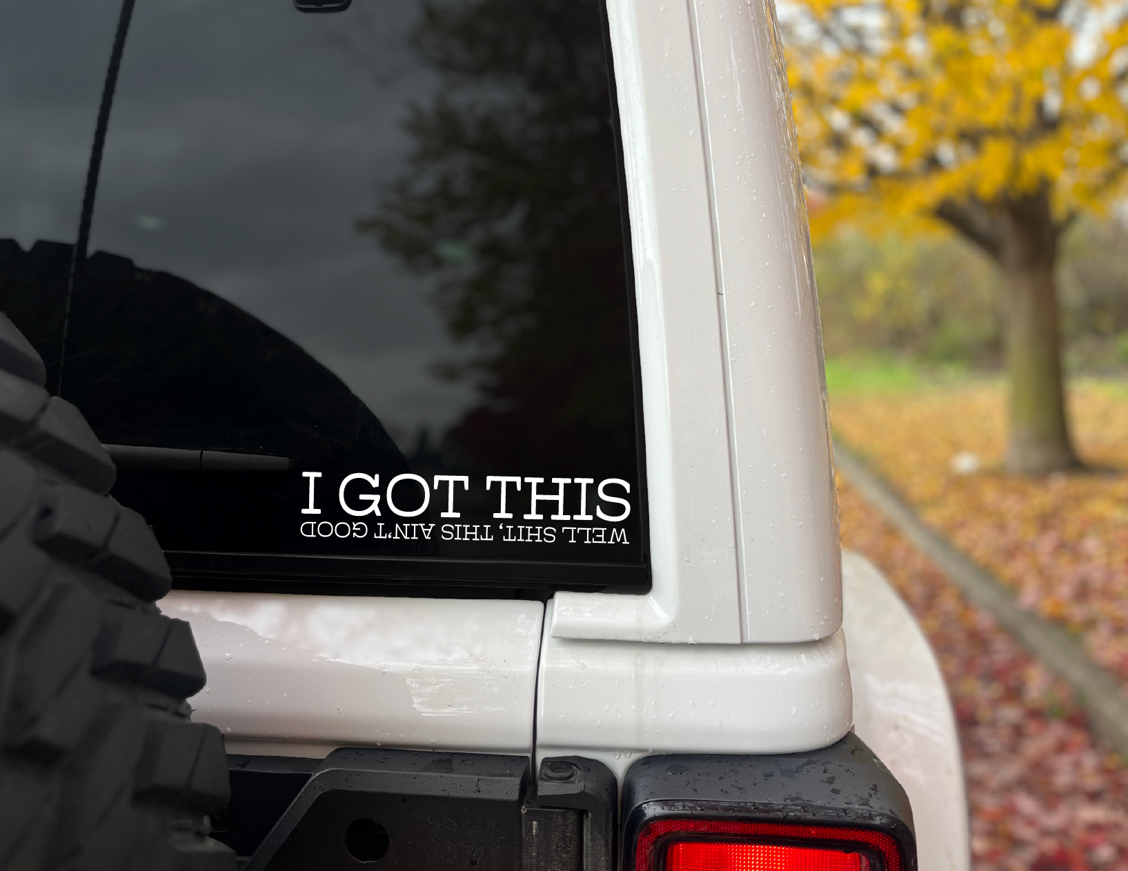 This decal is a playful nod to the unpredictable world of offroading, where rolling over is just another plot twist in the story. The vinyl decal states “I Got This” in big bold text, then in smaller text written upside down below it states “Well Shit, This Ain’t Good” making reference to it being legible when upside down.