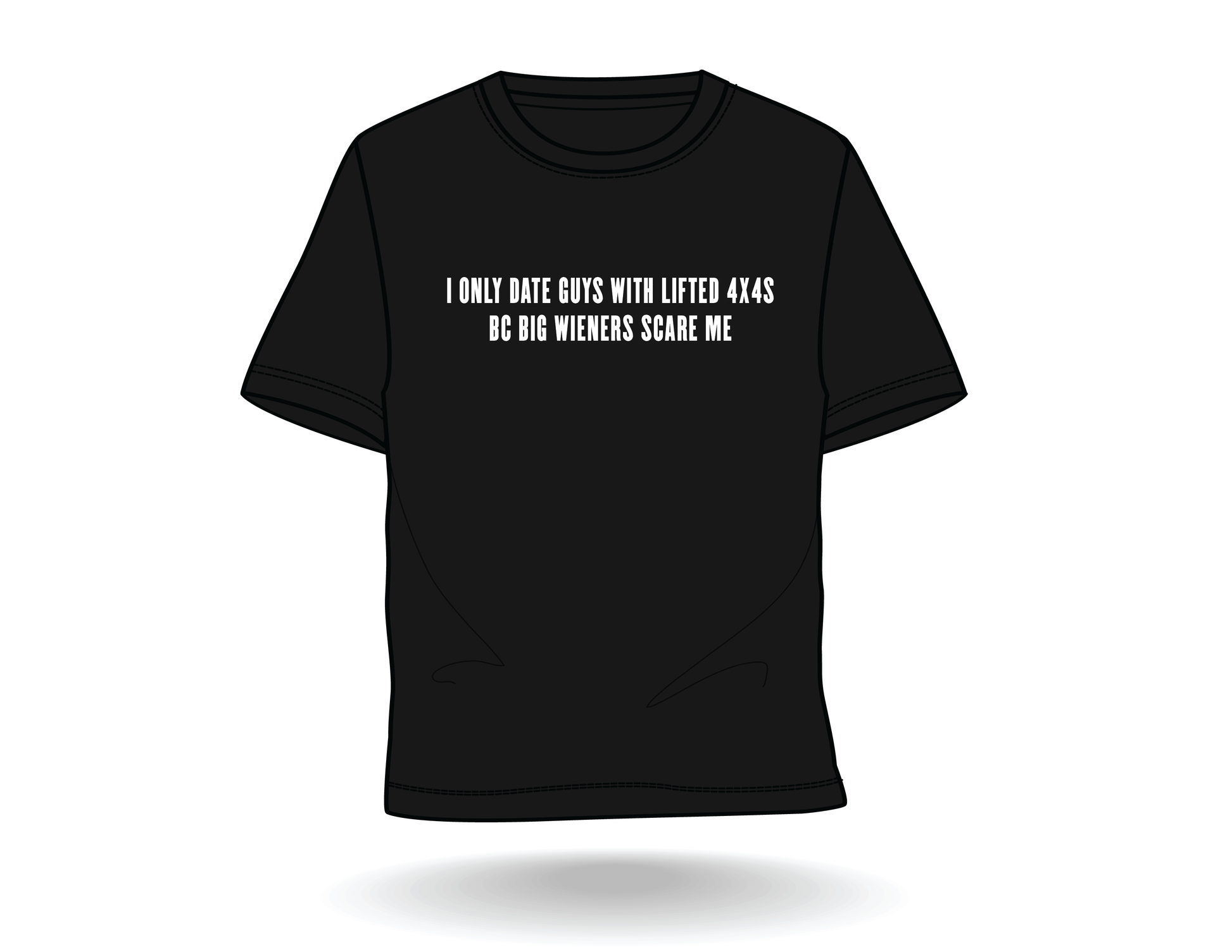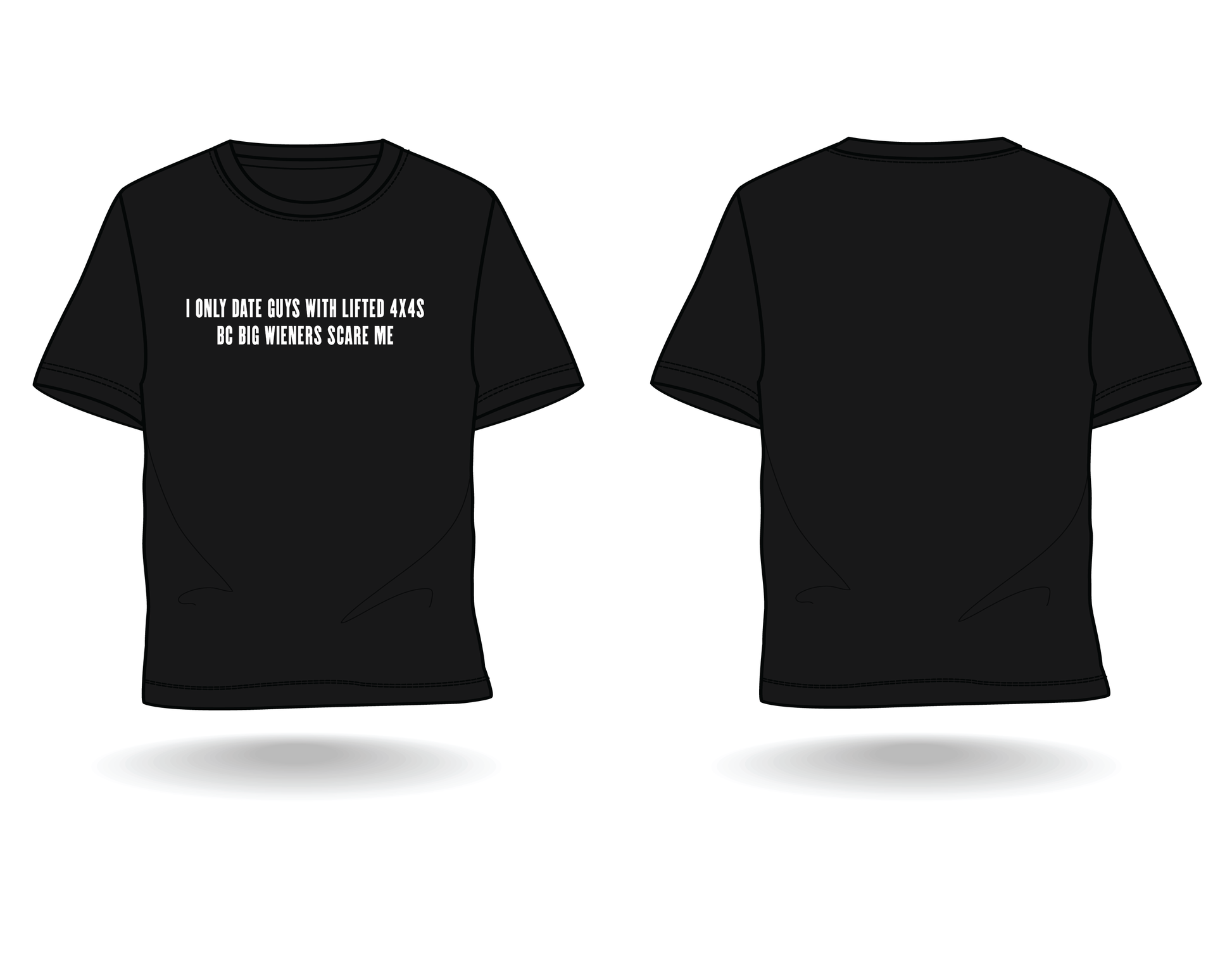 With the cheeky statement, “I only date guys with lifted 4x4s bc big wieners scare me” this tee is all about embracing the fun, flirty side of off-road culture. It’s the perfect way to spark a laugh at the next meet-up, trail run, or wrenching session in the garage.