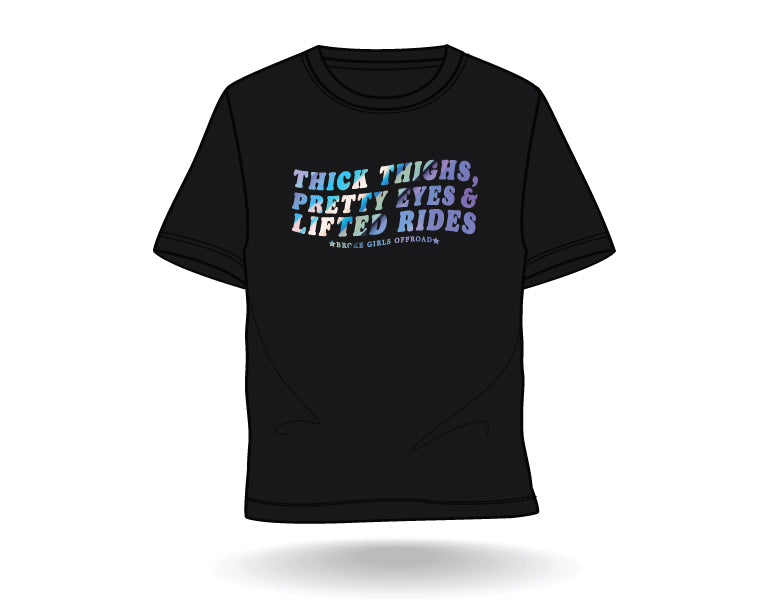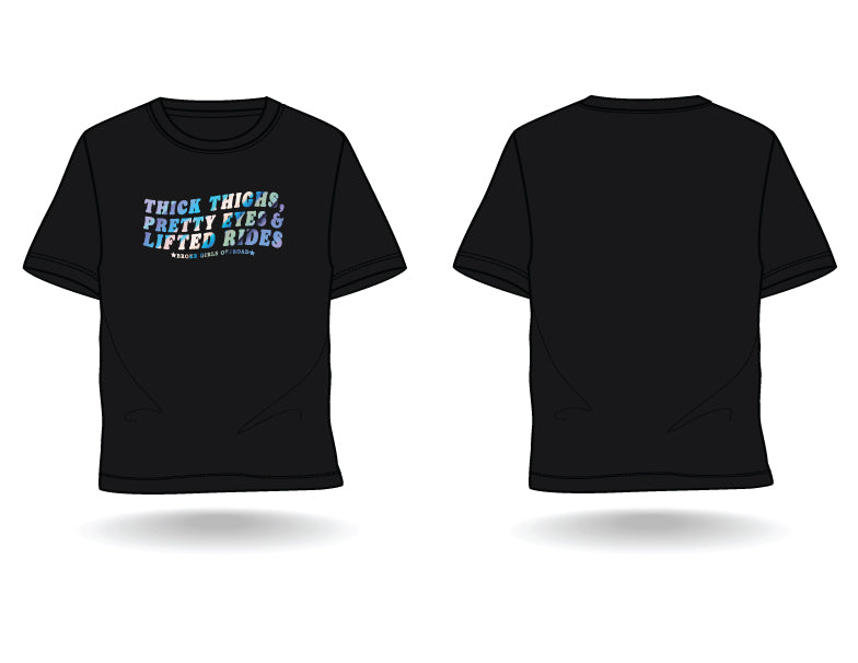 With “Thick Thighs, Pretty Eyes and Lifted Rides” across the front in bold, wavy text, this tee brings big energy with a playful twist. Available in white or holographic lettering, it’s the perfect way to match your mood, your rig, or your favorite trail ‘fit — and let everyone know exactly what kind of ride you're into.